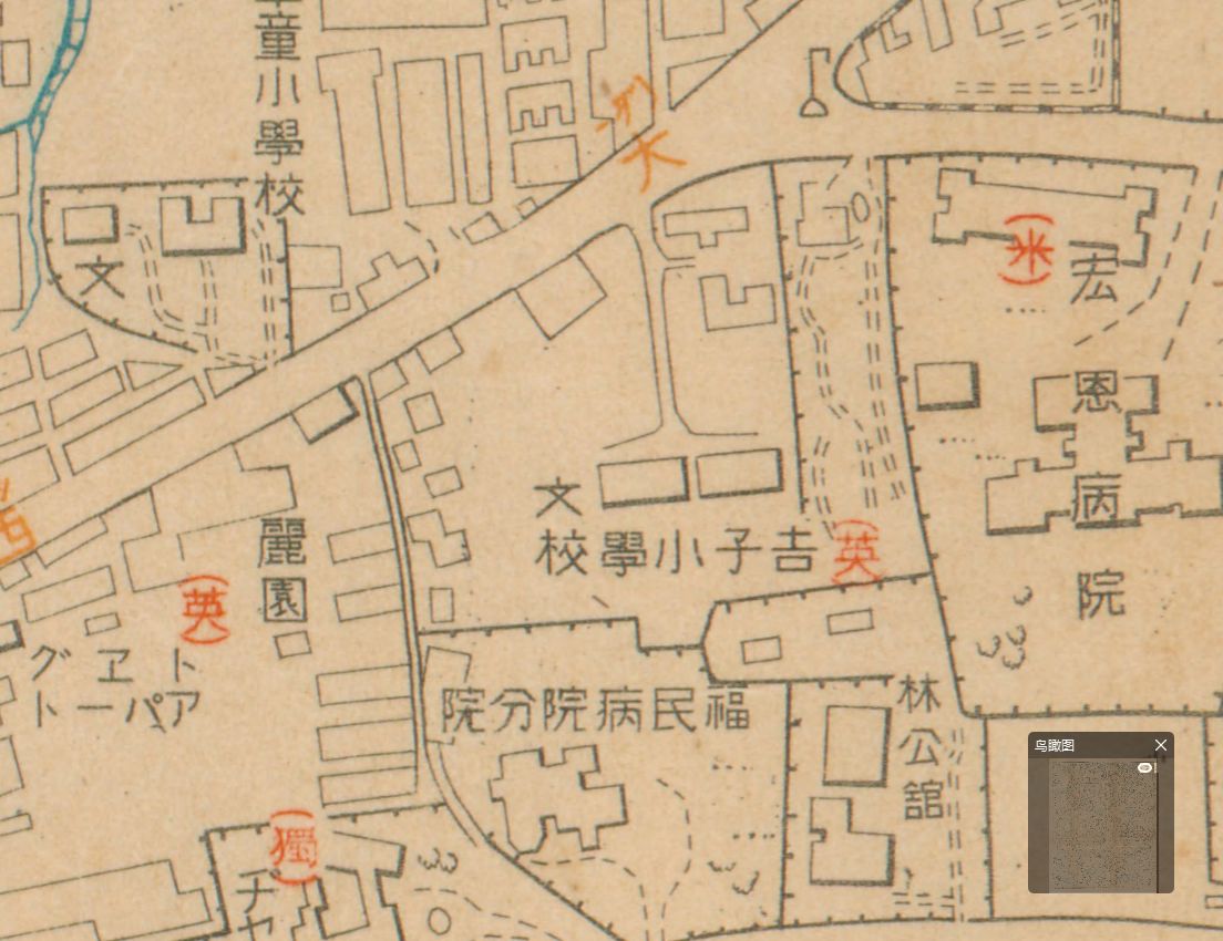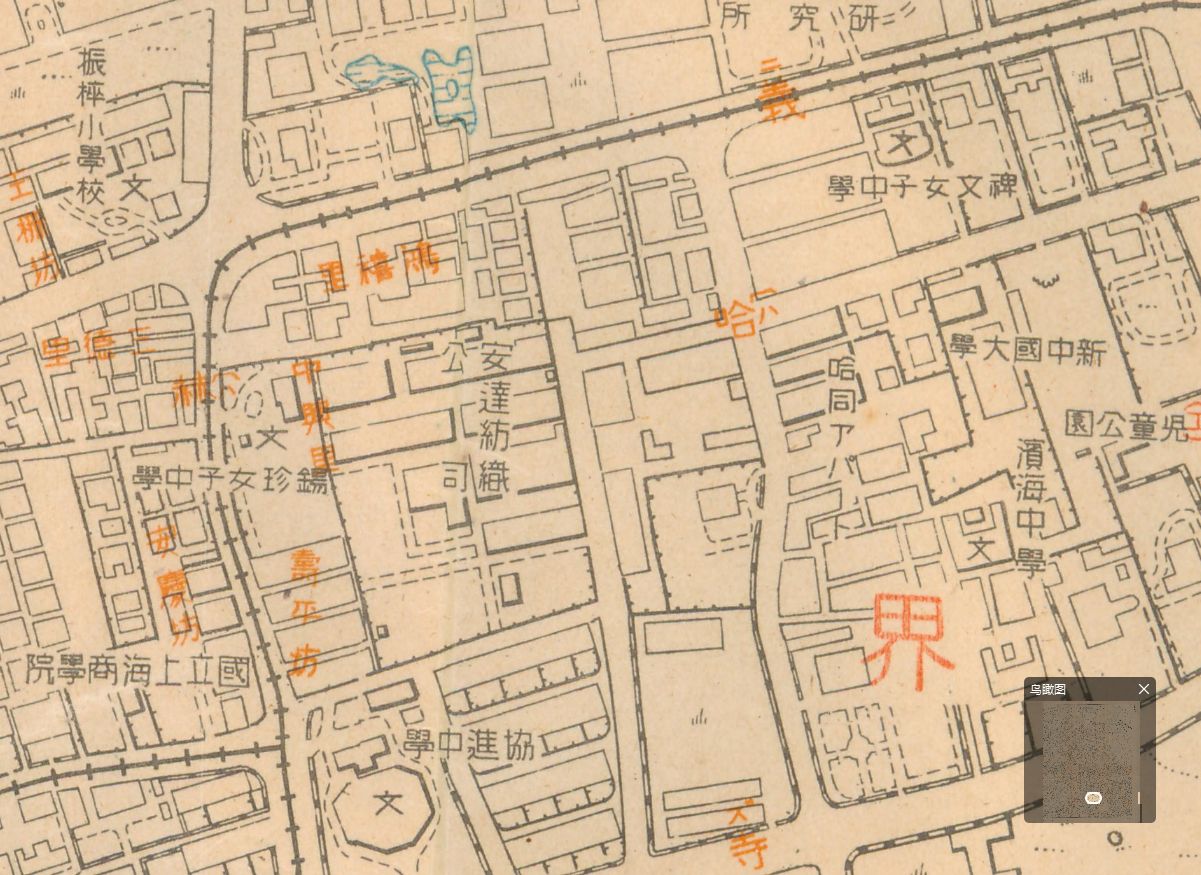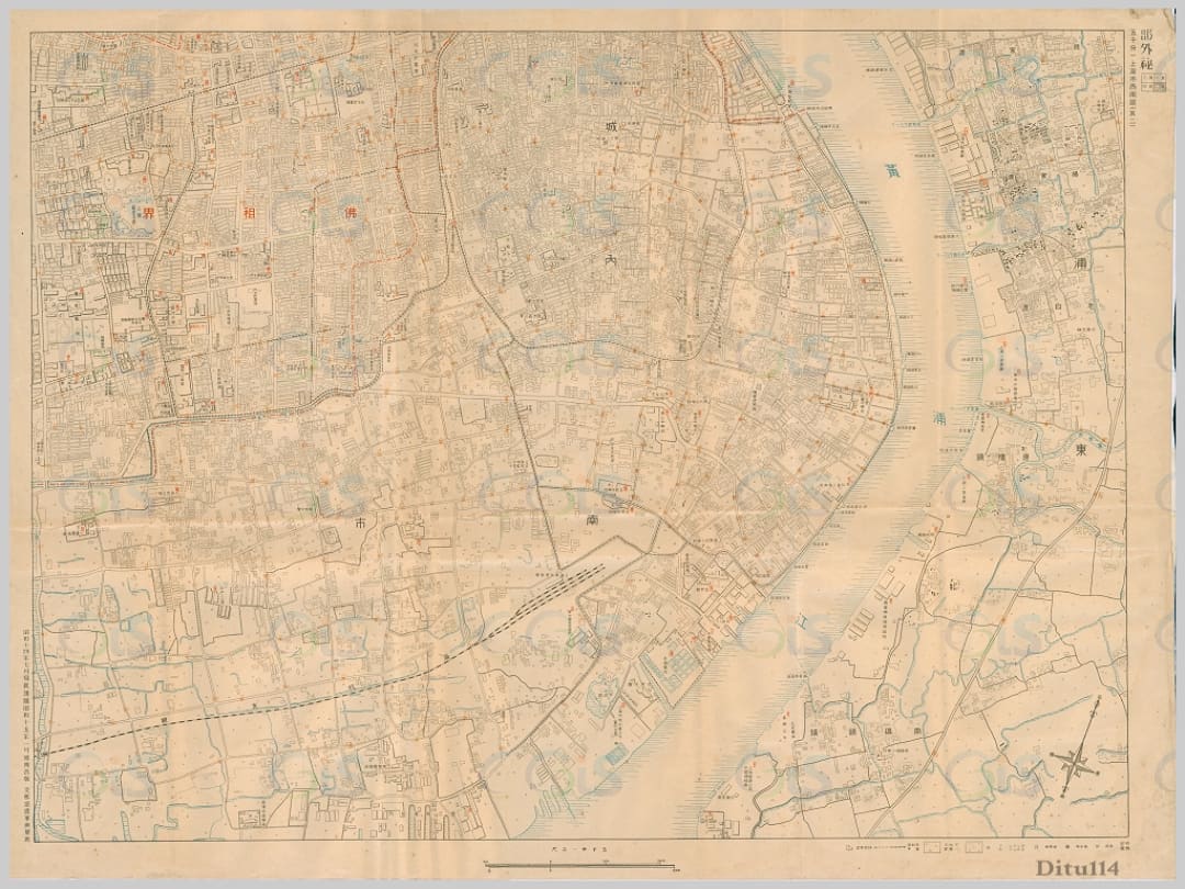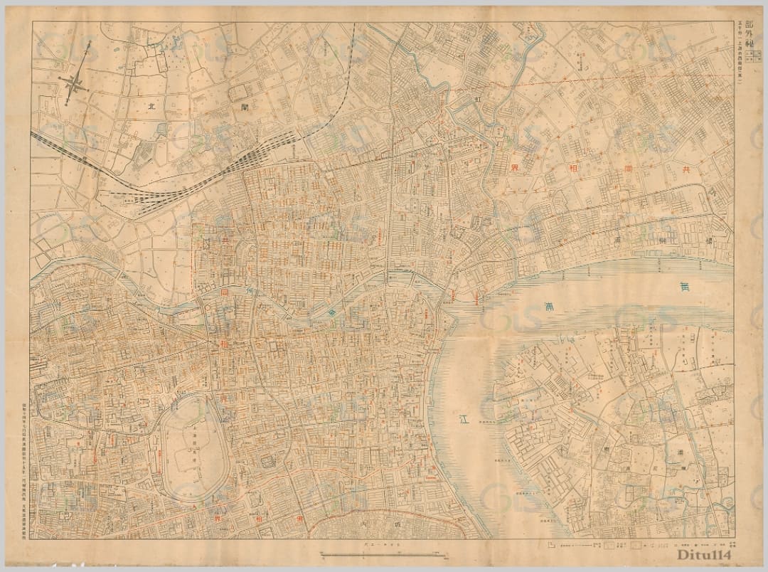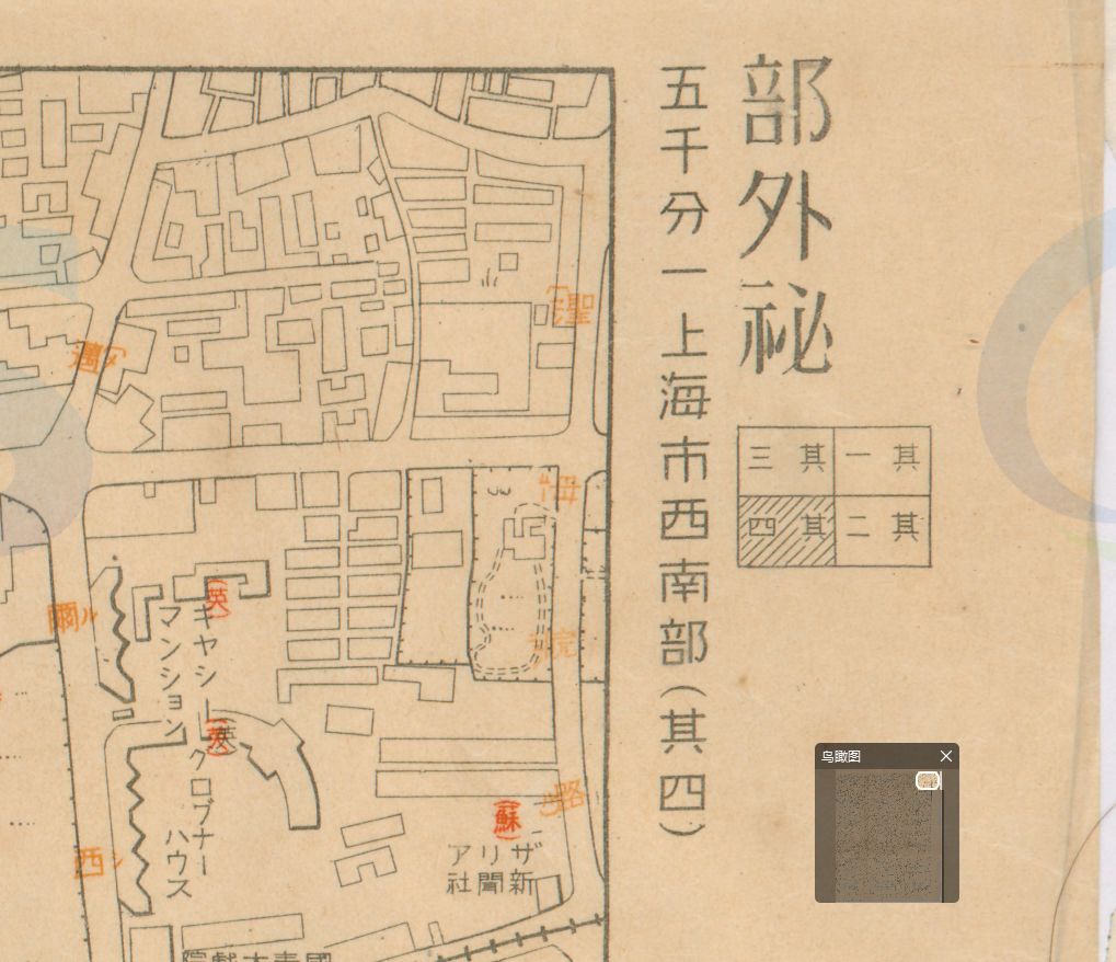 该地图以较为精细的线条勾勒出1940年代上海西南部的城市肌理,包括密集的街巷网络、建筑轮廓、水系分布以及重要的机构设施。部分区域使用红色字体标注“英”、“蘇”等字样,直观反映了当时租界及各方势力范围信息。4幅分图各由两张图片拼合,单张图分辨率高达12463×10000像素,8P总下载大小为188MB,为研究抗战时期上海的城市格局、历史地理及建筑风貌提供日方视角下的图像资料。