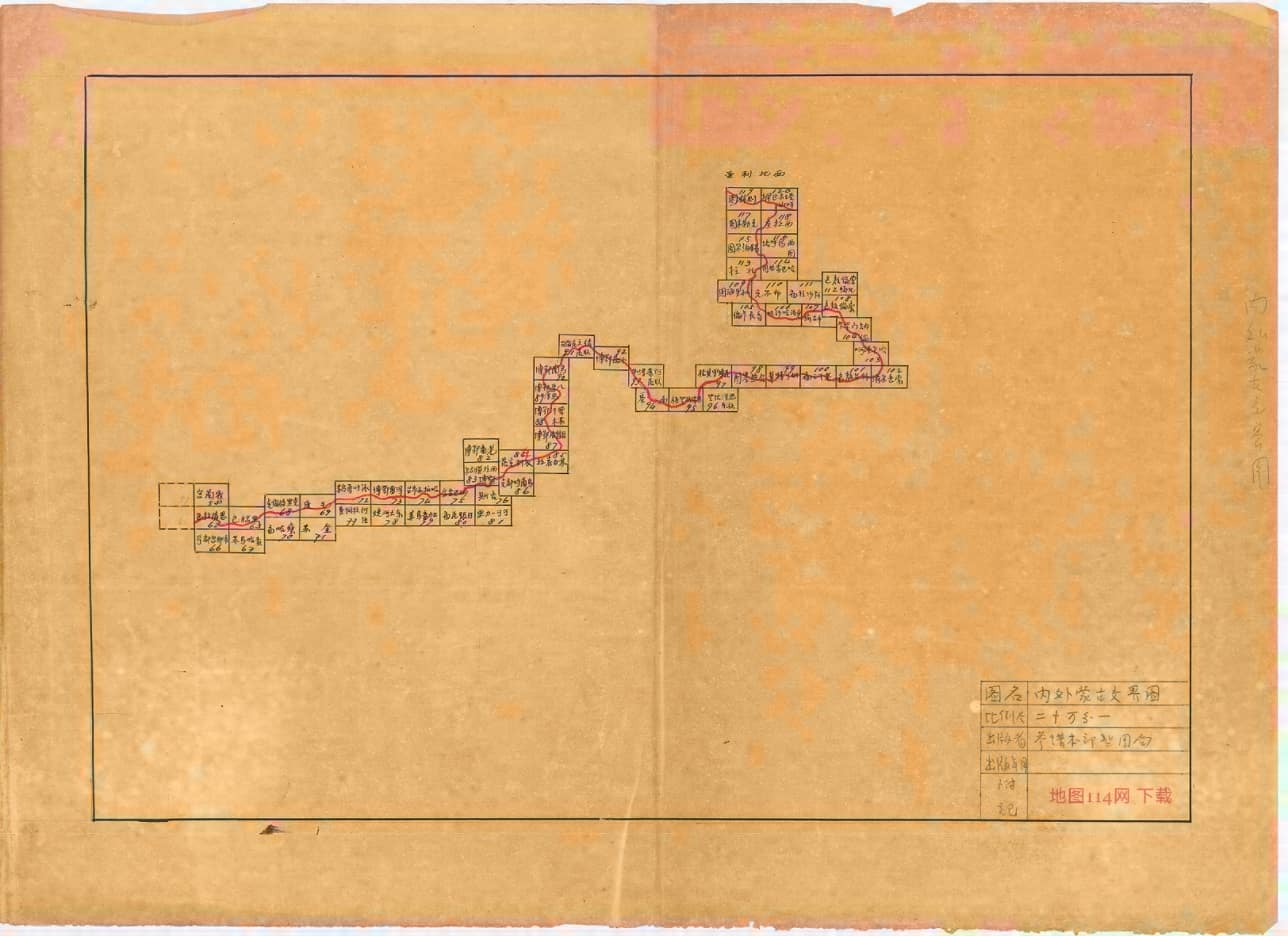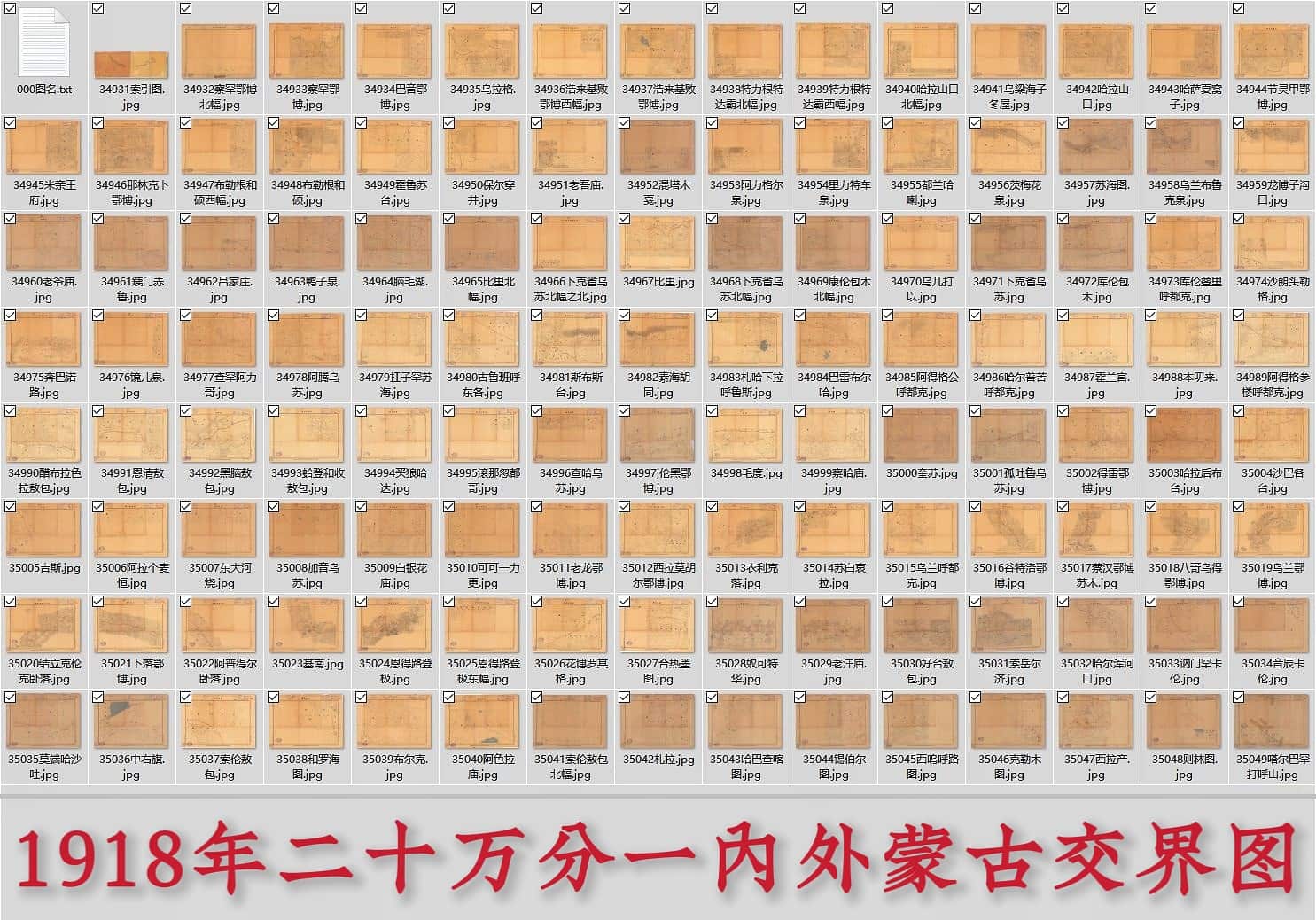 图册题《二十万分一内外蒙古交界图》,绘制于民国7年(1918年10月至12月),分图比例尺为1:200000,由彼时参谋本部攷(考)察蒙古地形队实地测绘,制图局缩制而成。图册文件共包含119个图片,下载大小约为1.2GB。