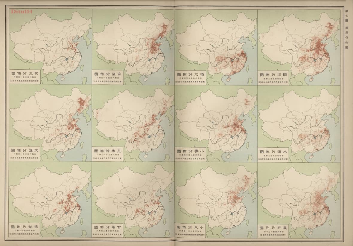 图集内容细致丰富,例如政区总图以红色实线标示边界、蓝色线条勾勒水系,地文总图采用分层设色表现地形,农产分布图以点密度展示农业生产力。所有地图均源自原始图册,反映1930年代中国行政区划、自然地理、经济分布等状况,画面清晰,标注丰富。