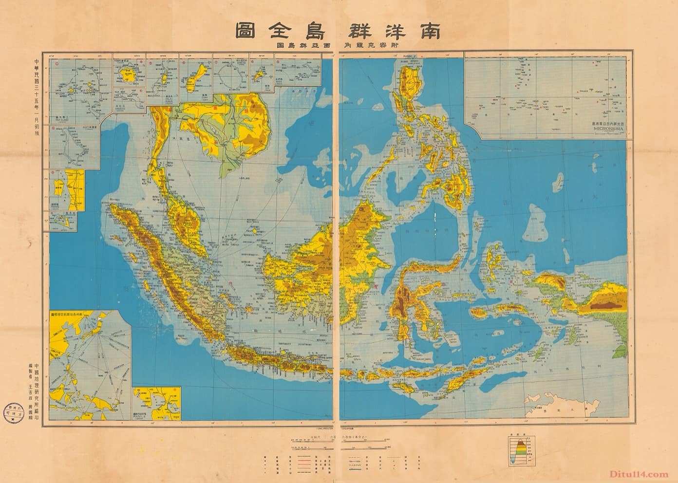 图题《南洋群岛全图(附密克罗尼西亚群岛图)》,由中国地理研究所于民国35年(1946年)1月初版发行,王吉波、房国翔编绘。地图比例尺为1:6400000,采用全色分层设色,中文标注,原件尺寸为左幅47×70厘米、右幅45×70厘米。其范围涵盖马来西亚、印度尼西亚、新加坡、菲律宾等东南亚地区,并附有重要岛屿的放大详图。