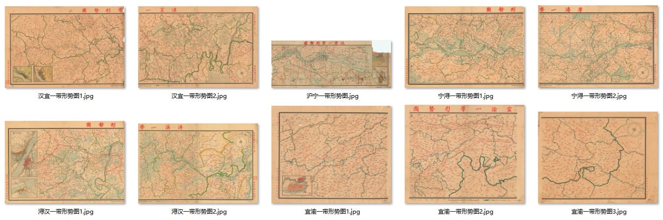 图册题《沪宁浔汉宜渝一带形势图》,为20世纪30年代由参谋本部湖北陆地测量局绘制的一系列军事地图,比例尺均为1:250000,涵盖沪宁、宁浔、浔汉、汉宜、宜渝等长江流域关键区域。该系列绘制时间从民国21年10月持续至民国25年4月,包括五张分图,以线条和符号精细呈现地形地貌、交通线路及城镇布局,色调古朴,直观反映了当时的地理与军事形势。