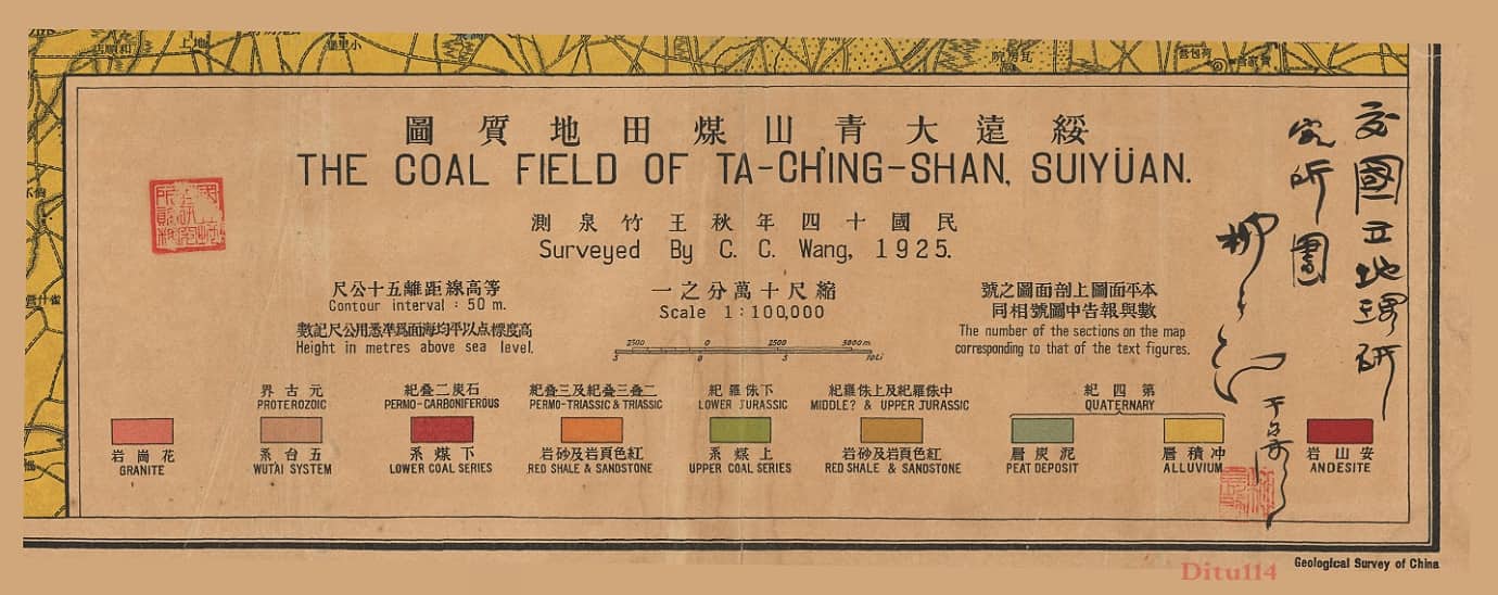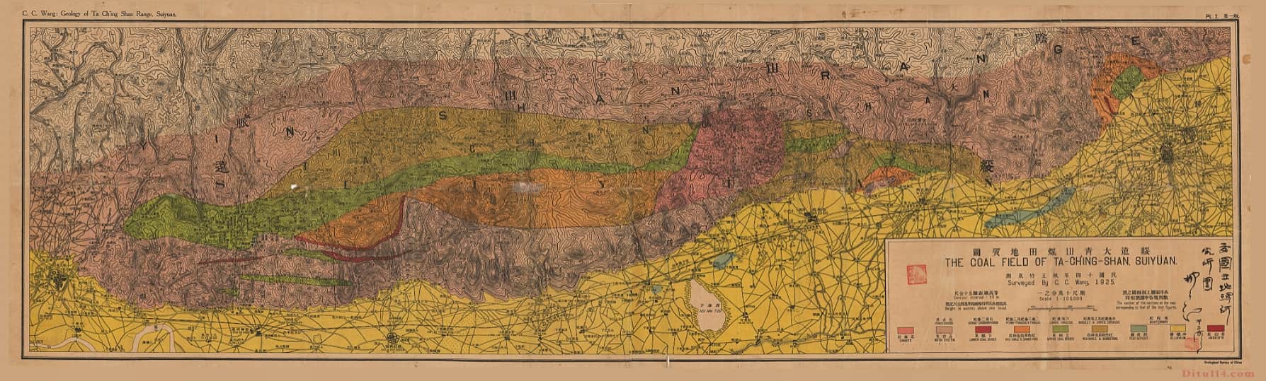 图题《綏遠大青山煤田地質圖》,为地质学家王竹泉于民国14年秋(1925年)测绘的一版专业地图,比例尺为1:100000,采用素面多色印刷,原件尺寸为48×158厘米。全图以高清细节展现了大青山煤田的地质结构,通过不同颜色区分了元古界、二叠纪含煤地层等多个地质年代和岩石类型,并标注了山脉、地形、等高线等地理要素。