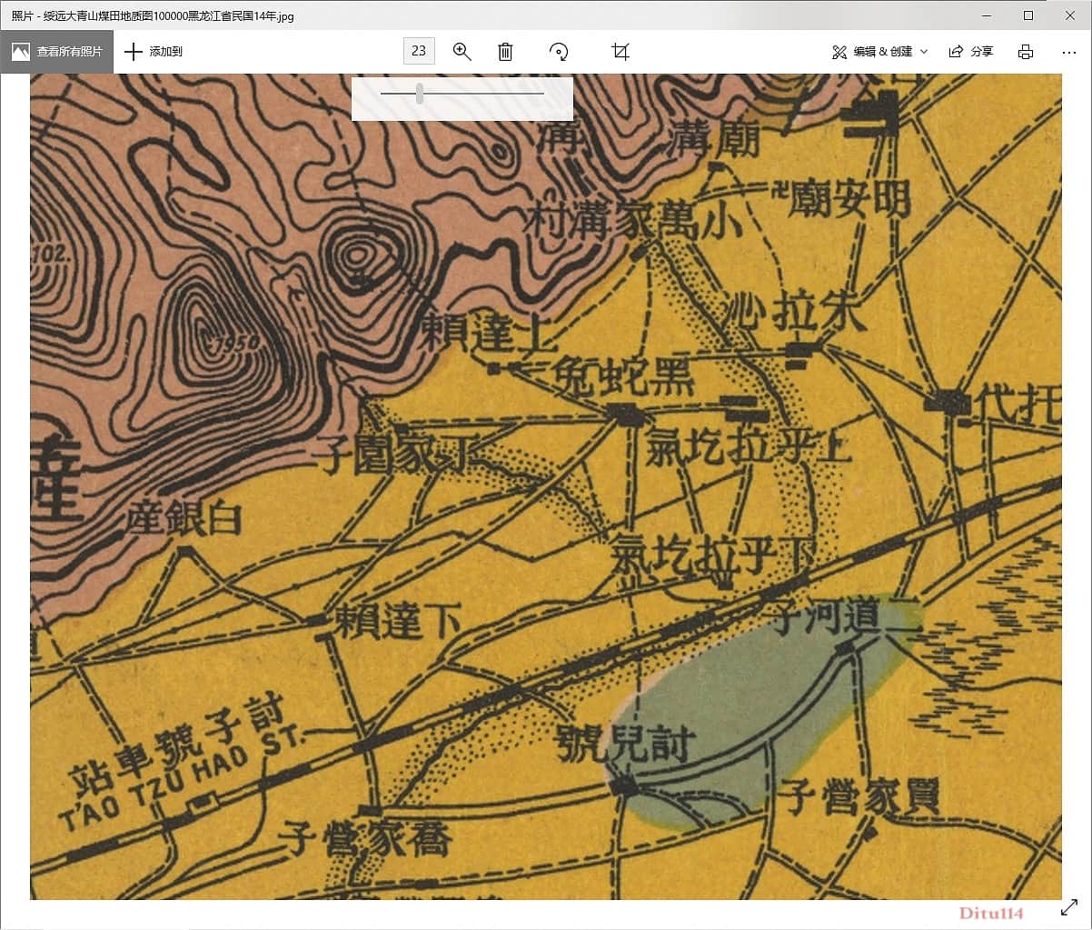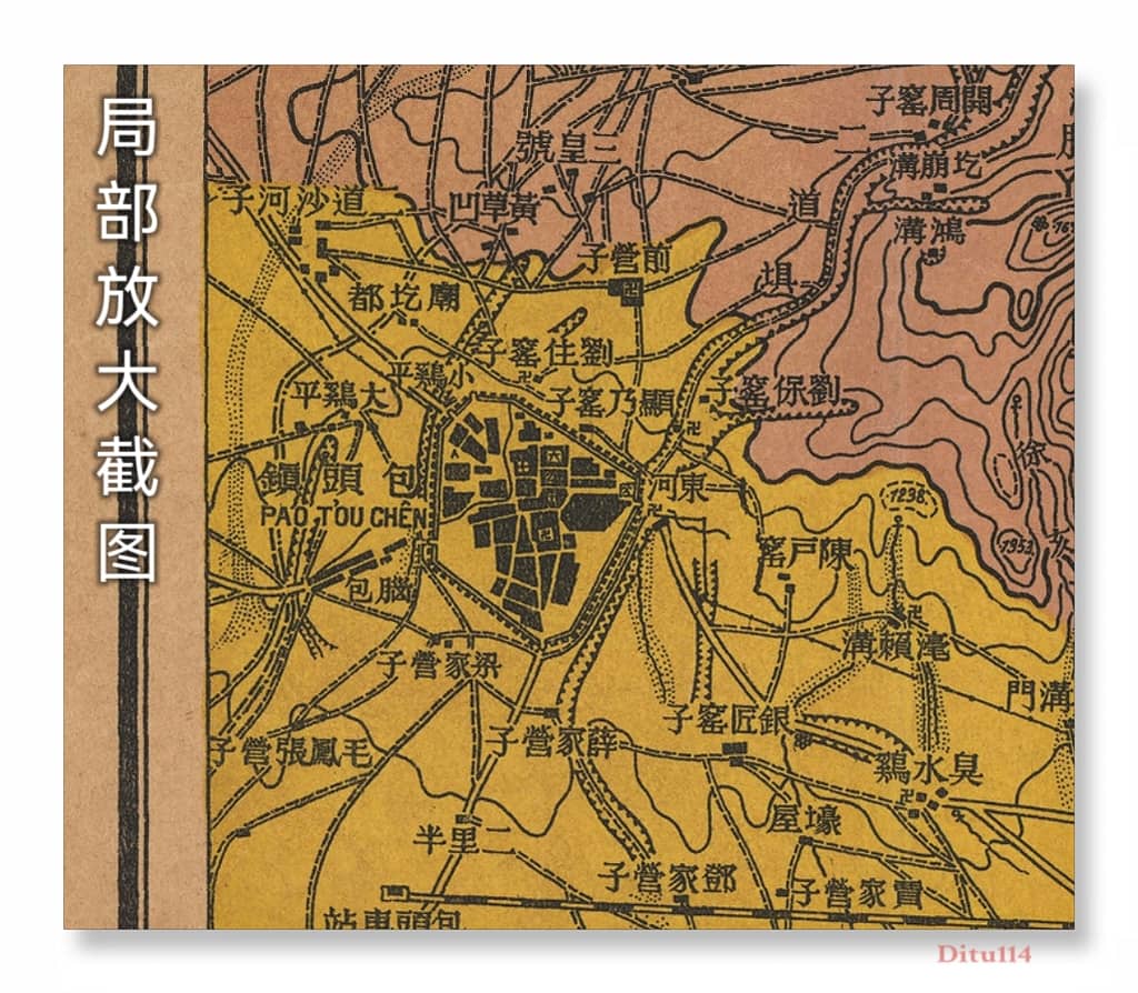 图中包含了丰富的地名信息,如包头镇、子营前等村镇,以及道路、沟渠等脉络,并配有中英文对照注释,全面呈现了区域地质与地理状况。本图提供高清数字化版本,原图尺寸达19001×5592像素,下载大小为46.5MB,适合地质研究、历史考证和地图爱好者下载使用。