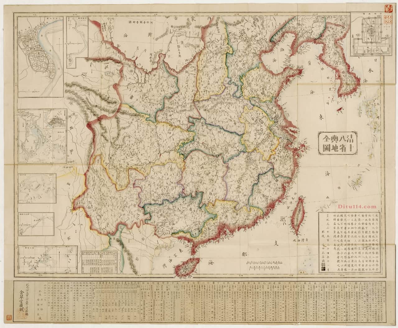 本文提供《清十八省舆地全图》高清原图下载。该图由津田静一编制,日本含翠堂于1875年(纪元2535年)出版,为铜版彩色印刷。地图比例尺为1:4687300,原件尺寸62×86厘米,其范围覆盖清廷十八省及朝鲜地区,采用晕渲法表示地形,内含8幅插图、各省说明文字及里程表。