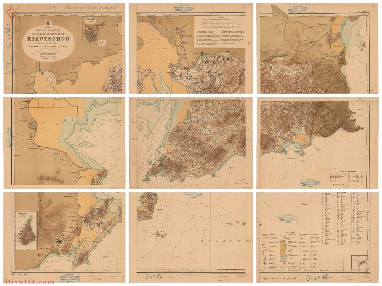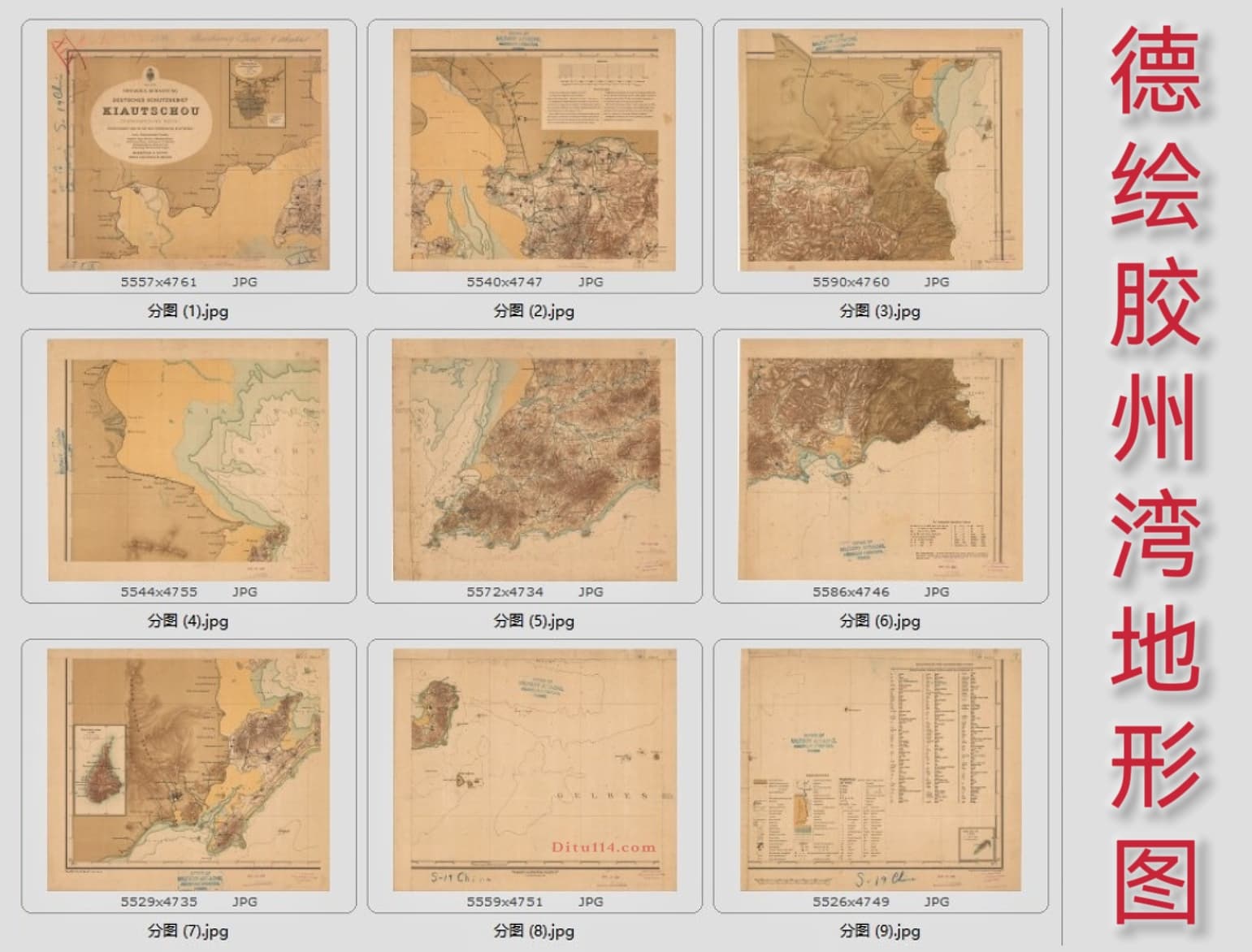本资源提供一套1906年由德国海军部出版的胶州湾地形图高清下载,比例尺为1:50000,采用素面多色绘制,德文与英文双语标注,原件由分图九幅拼合而成,单图尺寸为47cm×40cm。地图标题为“KIAUTSCHOU”,副标“DEUTSCHES SCHUTZGEBIET”,其数据基于1898/99年实地测绘编制,该版本为1906年发布第二校正版。图中详细呈现胶州湾沿岸地形、水深、城市布局及基础设施,如青岛新城、港口和铁路信息。