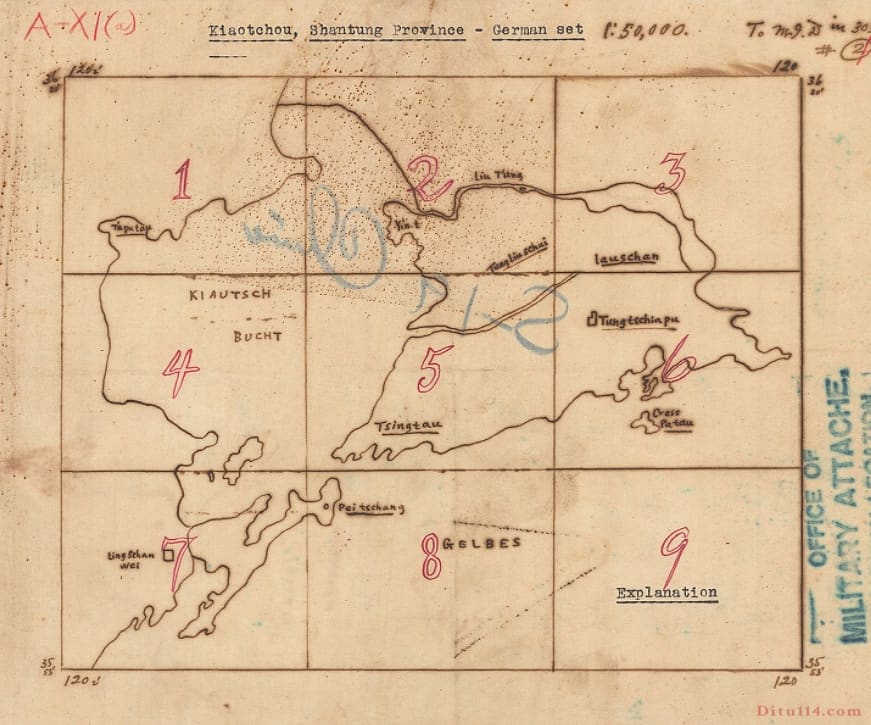 地图采用多圆锥投影法,高程深度以米为单位,测绘范围覆盖胶州湾德国占领地全境,包含崂山地区简化测量和1902年2月前更新的城市规划。其内容源自德国海军测量团队,并整合了山东铁路公司提供的资料,具有殖民时期的军事测绘特征,是研究近代青岛历史与地理的参考文献。