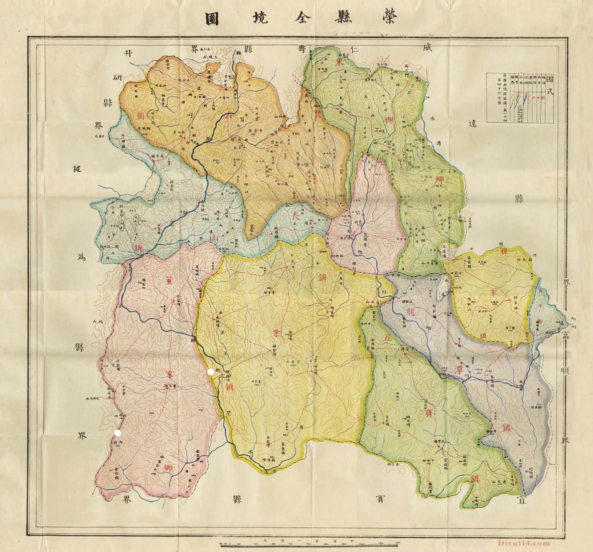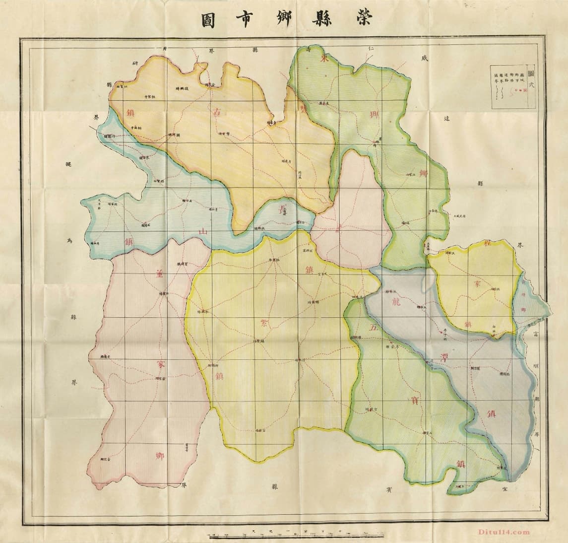 本图包提供一组1929年绘制的荣县老地图高清下载,包括城治图、全境图、山脉图、水道图和乡市图,共计五幅。这些地图均基于原始图纸扫描,清晰展现了民国中期荣县的地理风貌、行政划分及自然环境。地图内容详实,城治图勾勒了县城街巷布局与周边山水,全境图以色彩区分区域并标注地名,山脉图以等高线显示地形起伏,水道图重点描绘河流水系分布,乡市图则标明了乡镇界限和交通网络,对荣县历史地理研究具有一定的参考价值。