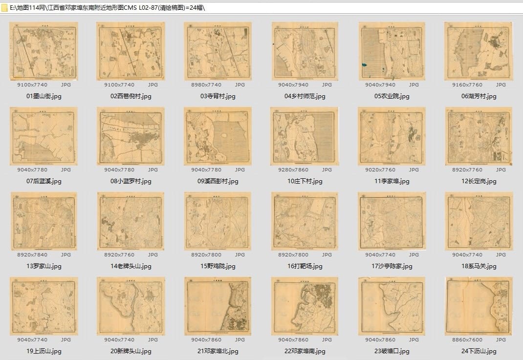 地图详细绘制了邓家埠东南区域的地形地貌,涵盖了多个村落、山体及重要地标。文件下载包总大小为148MB(JPG图片格式),内容清晰,是研究当地历史地理的珍贵资料。