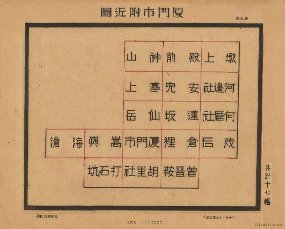 该套《福建厦门岛附近图》是由福建省陆地测量局于民国时期编绘的高清老地图集,比例尺为1:10000,出版时间为民国十八年七月至八月和二十六年十一月至十二月。地图采用单色印刷,原件单幅尺寸约60*50厘米,整体风格古朴,以等高线精细呈现厦门岛及周边地形起伏,并标注了众多村落、道路和海岸线细节,生动反映了当时的地理风貌和人文分布,是研究民国厦门历史变迁的珍贵资料。