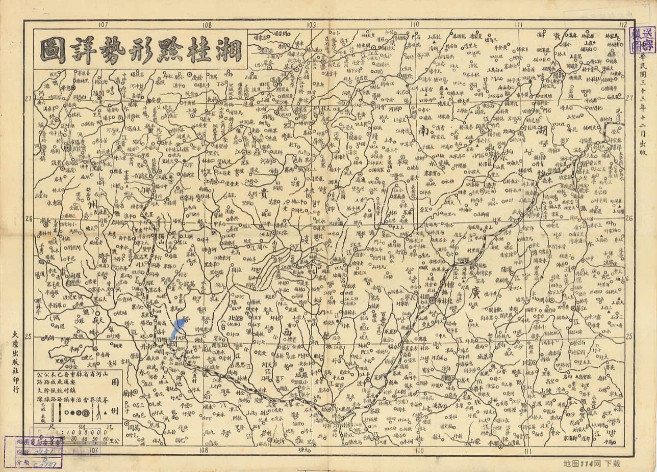 图题《湘桂黔形势详图》,由大陆出版社编绘,出版于民国三十三年十二月,全图比例尺为1:1000000,单色老地图。原件尺寸为52×37厘米,原图高清扫描尺寸为6419x4620像素,下载文件大小为13.7MB。