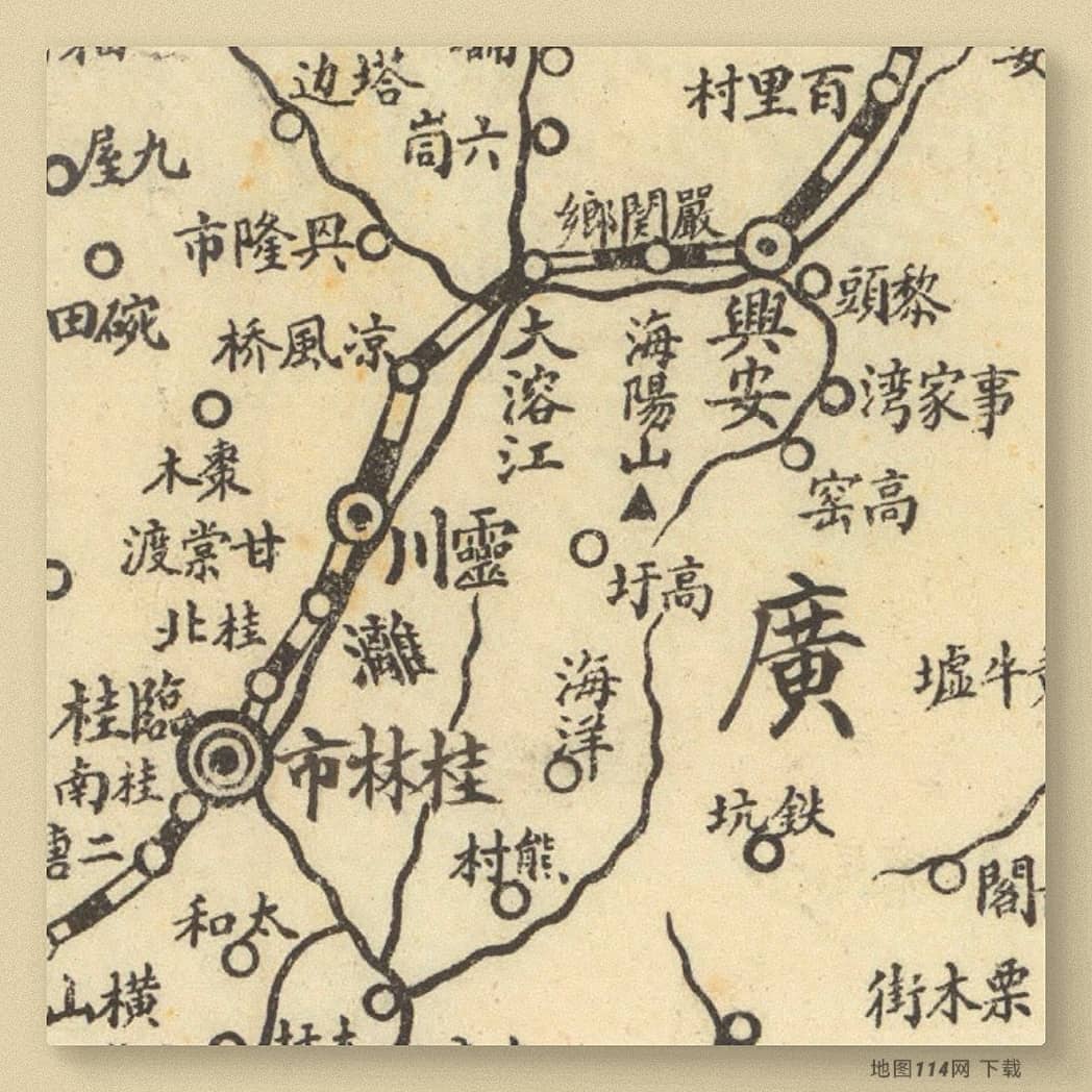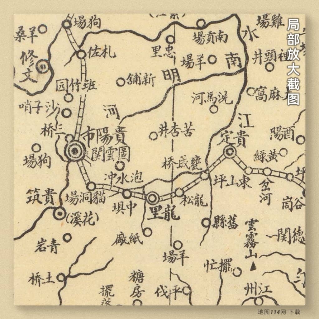 本图行政界不完整,范围以湘桂黔铁路沿线为准,绘有铁路、河川、地名等地理信息,但无地形资料。地图布局紧凑,以简洁线条标注交通网络与河流分布,呈现出当时湘桂黔地区的地理概况。高清原图便于详细查看沿线细节,如贵阳、桂林等重要地点。