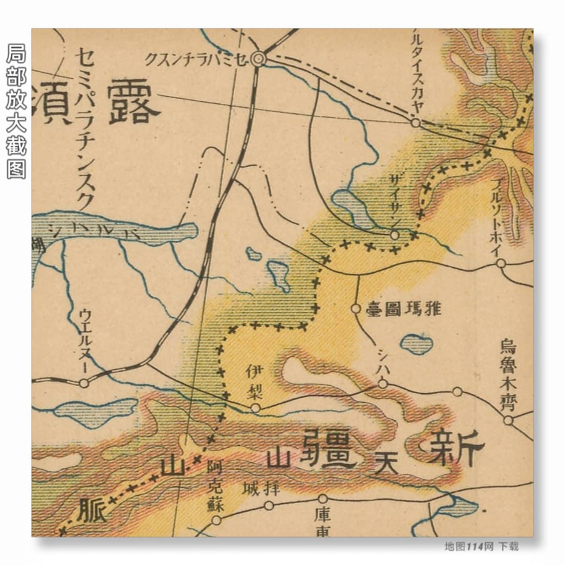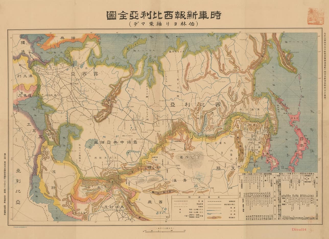 图题《时事新报西比利亞全圖》,由时事新报社于日本大正七年四月(1918年)发行。全图采用彩色印刷,比例尺为1/16800000,原件尺寸62*45cm,以中文和日文双语标注。原图分辨率9708x7042像素,下载大小为21.7MB。