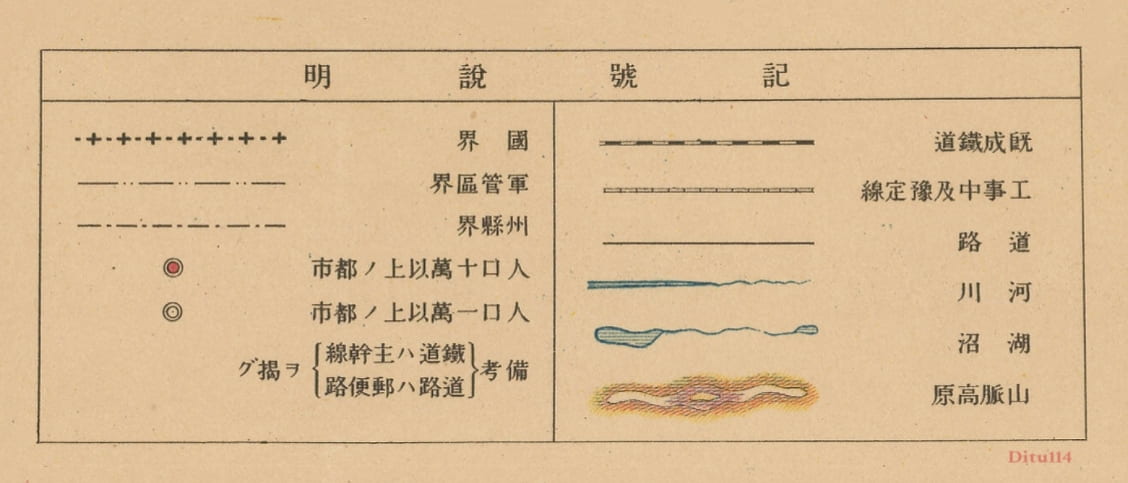 该图范围覆盖西伯利亚及周边区域,包括日本列岛、朝鲜半岛、中亚及清朝北部等地,展示地形、河流、城市、铁路及边界线等信息。图中以不同色彩区分地貌,右下角附有地名、人口数据表格,以及国界、军管区界、州县界等图例说明,呈现了当时日方视角下的地理与人文状况。